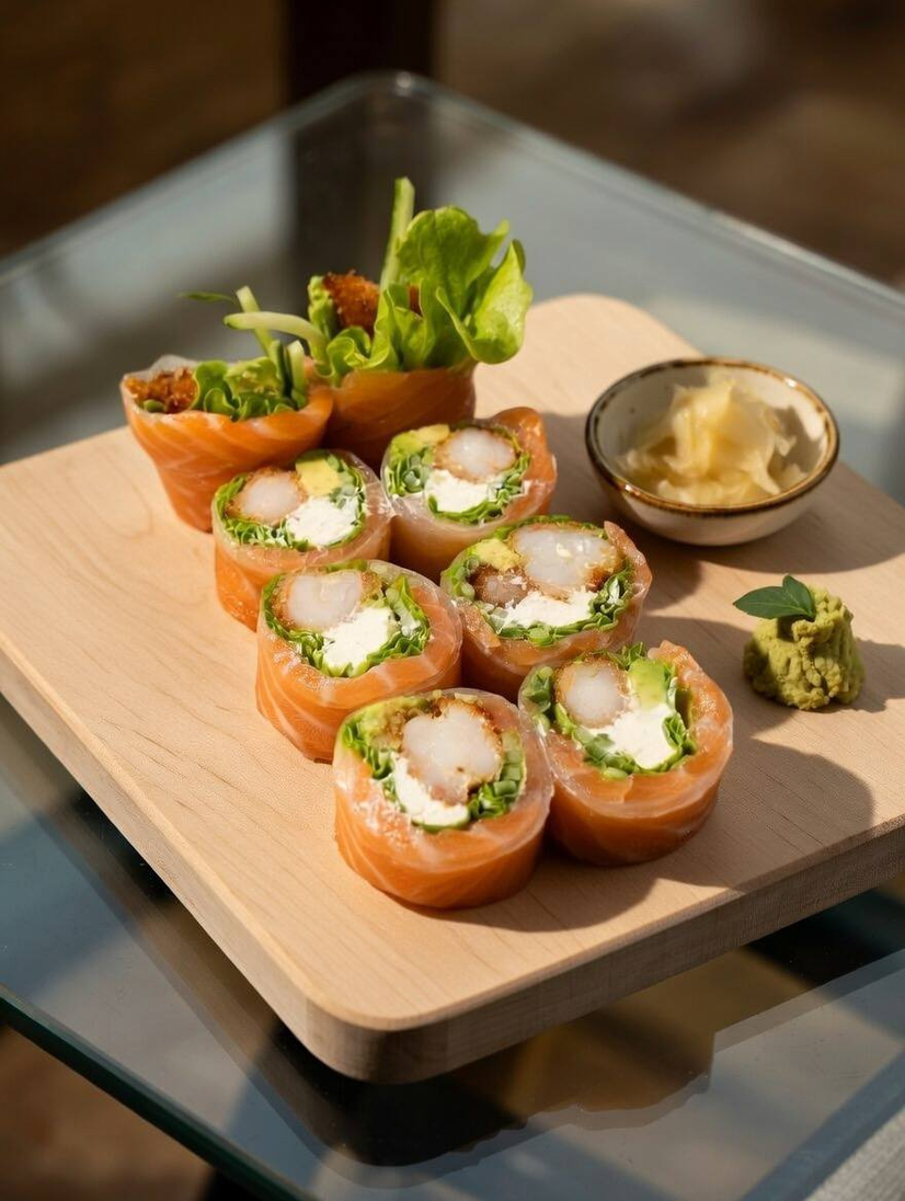 Рол без рису в рисовому папері з креветкою темпура та лососем
