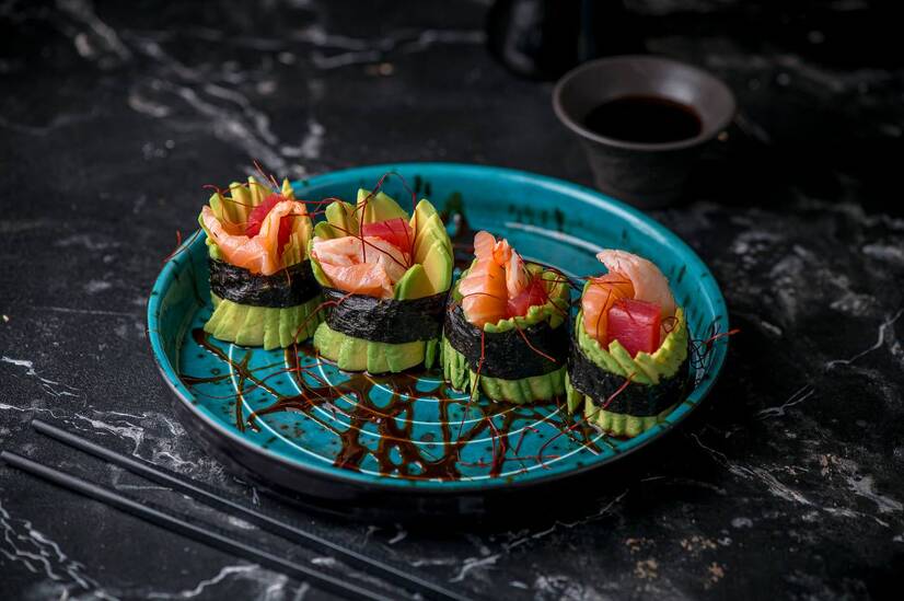 Рол «Дракон без рису» — це свіжість у чистому вигляді. Ніжний тунець, соковита креветка та стигле авокадо загорнуті в тонку стрічку норі. Жодного рису — лише яскравий смак моря, легкість і стиль.