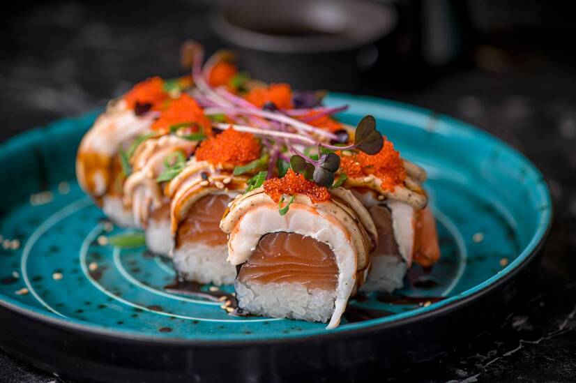 Рол «Кіото» — мінімалізм із максимумом смаку. Рис, лосось і креветка створюють ідеальний баланс текстур, а майонез і Унагі додають вершкової солодкості, від якої очі самі заплющуються від насолоди.