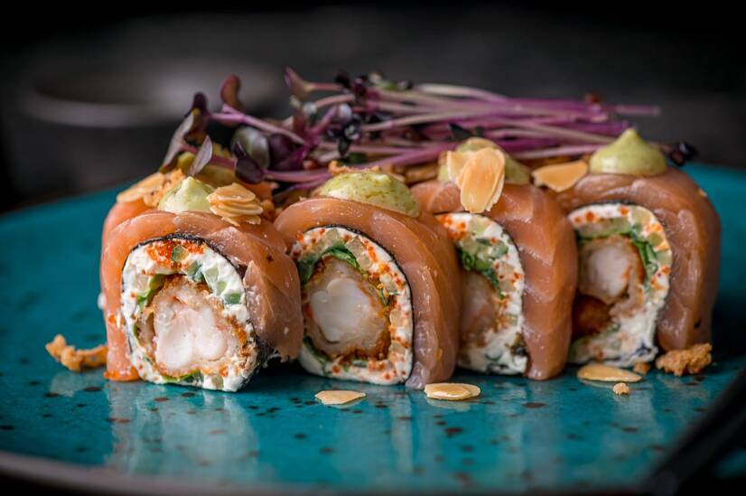 Рол «Сакура» — вибух смаку в кожному шматочку. Ніжний лосось огортає вершковий сир, хрусткі креветки в панко та свіжий огірок, а норі тримає все в ідеальному балансі. Солодкий соус із васабі додає легкої пікантності, мигдальні пелюстки дарують хруст, а мікрогрін — свіжість і яскравість. Кожен шматочок тане в роті, залишаючи відчуття гармонії та смакової розкоші.